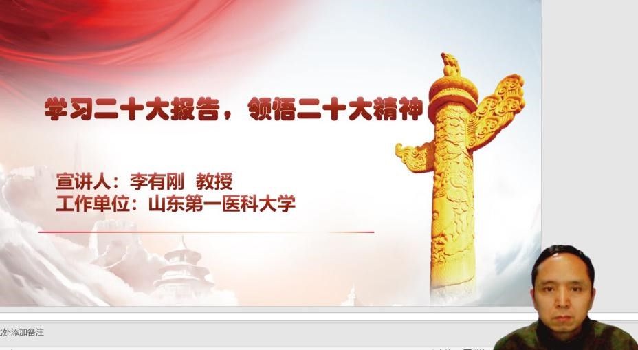 2022年11月25日19时,宣讲活动正式开始。beat365亚洲体育官方网站李有刚教授、博士(省属高公司党的二十大精神宣讲团成员、公司党的二十大精神宣讲团成员、泰安市社会科学专家)做了题为“学习党的二十大报告,领悟党的二十大精神”的专题报告。李教授从大会主题、报告结构、伟大变革、理论创新、使命任务、具体工作等多个方面全面解读了党的二十大报告的主要内容,报告的最后结合山东省情讲述了十年来我省的变革与成绩,在新的起点展望了山东省的新征程。活动结束后,公司党总支书记翟承强表示:“深入学习宣传贯彻党的二十大精神是beat365亚洲体育官方网站全体教师、全体党员在当前和今后一个时期的重要政治任务,广大教师党员要全面深入学习党的二十大报告,把党的二十大精神吃透拿准,摆正自己的政治站位,不断提升宣讲水平,以强烈的政治责任感和使命感投入到学习和贯彻党的二十大精神中去,努力为公司建设高水平大学贡献自己的力量”。