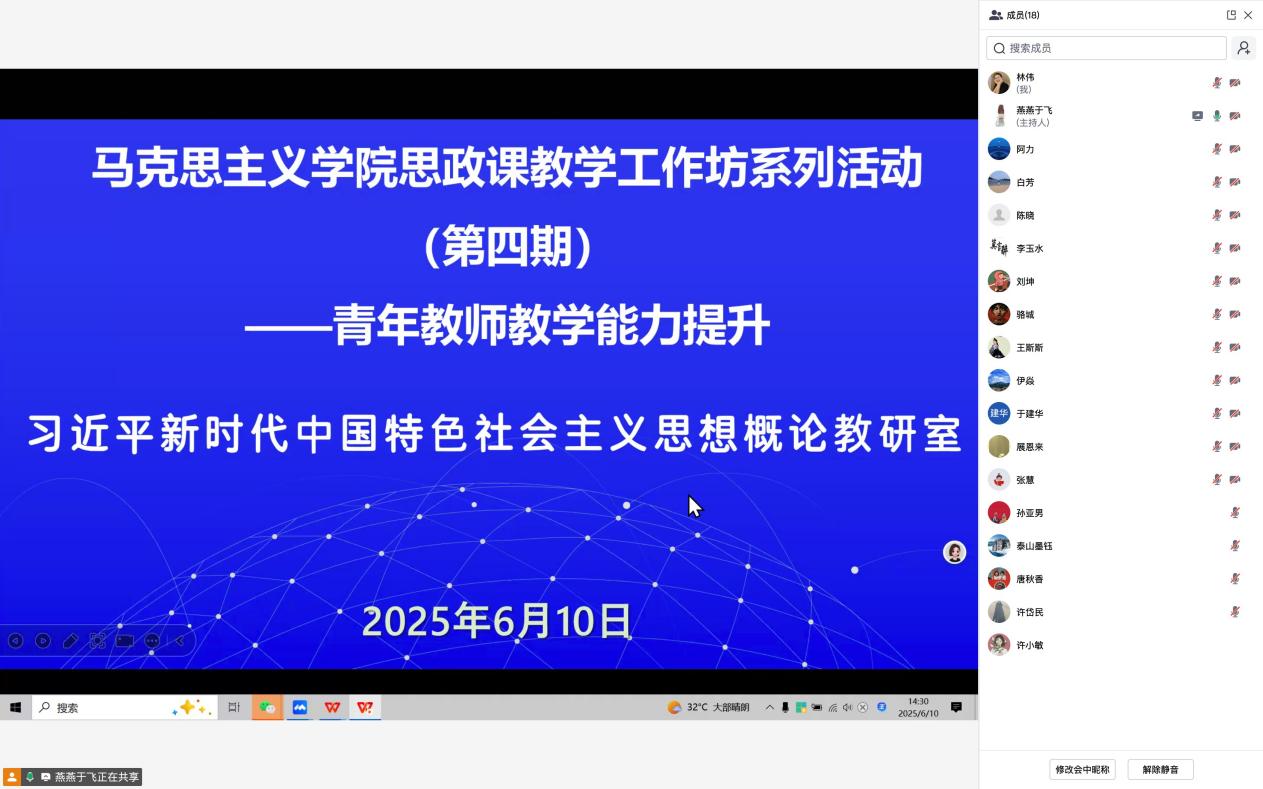 本期教学工作坊由习近平新时代中国特色社会主义思想概论教研室承办,以青年教师教学能力提升为主题,主要围绕“以赛促教提升”“影视资源赋能”“实践教学实施”“教学内容梳理”四大维度展开。